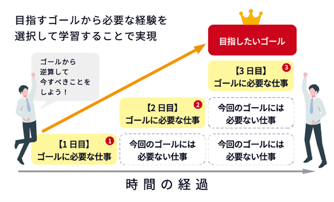 一般的な研修は教えて、試す中で成長させるという 積み上げ思考の研修となっていて、本当にその受講生にその学びが最適かわからないときもあります。
