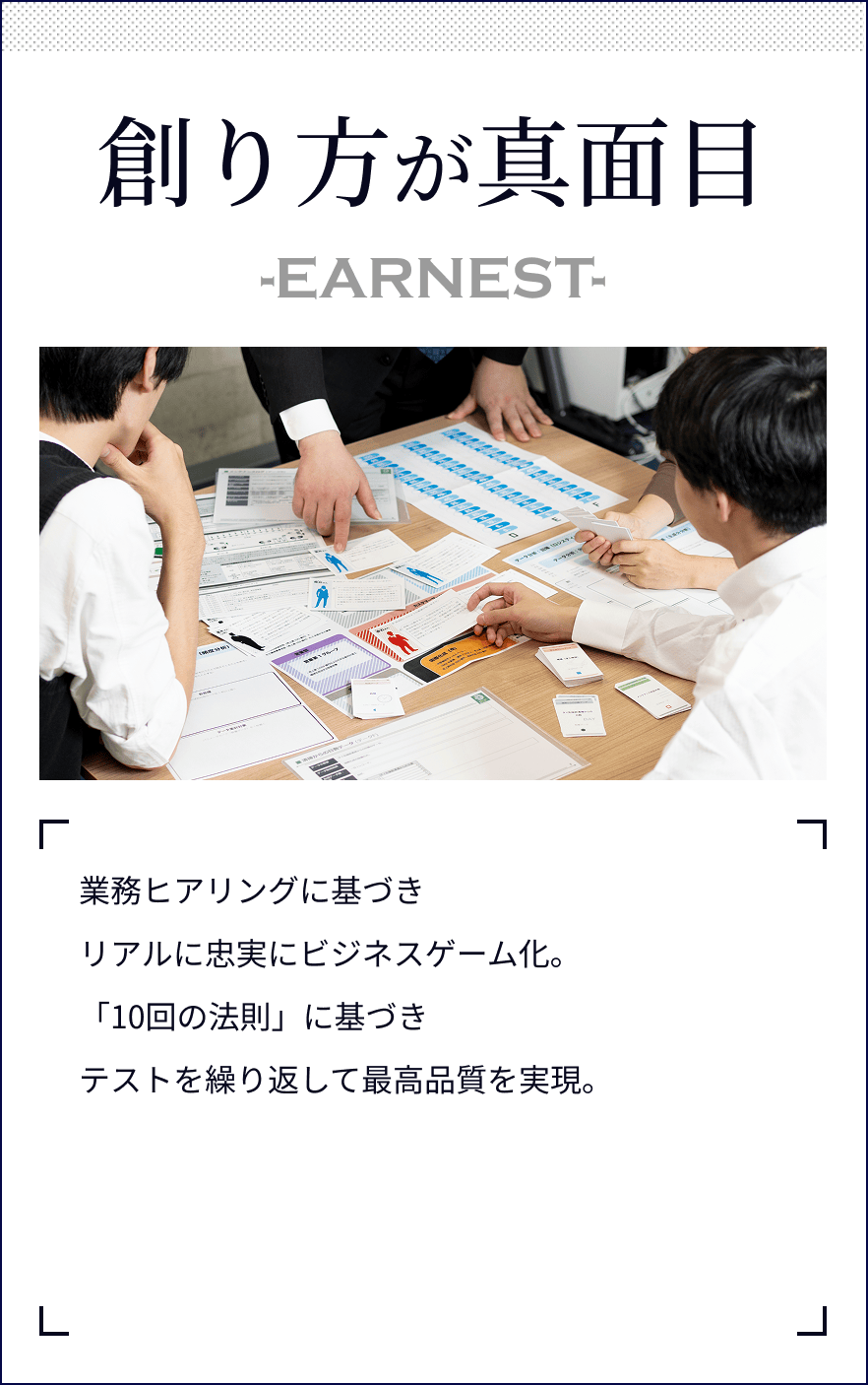 当社では「10回の法則(本当に良いビジネスゲームは最低10回のテストプレイが必要という先人の教え) 」に従い、貴社のご要望が実現するまでブラッシュアップを重ねていきます。