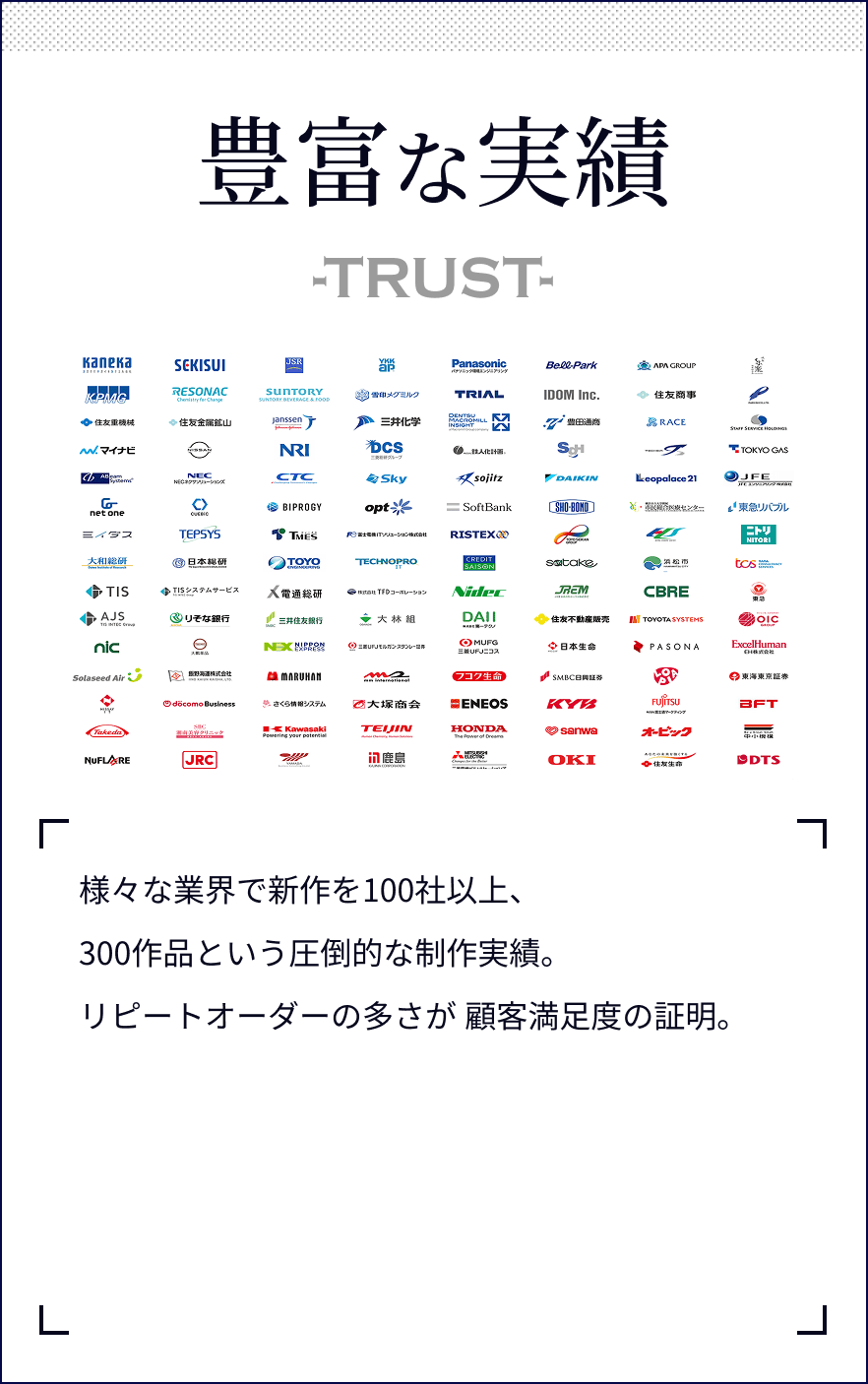 創り手は多彩な業界出身であり、これまでの制作実績も多くの業界にまたがっています。一例をあげると、日立製作所、住友化学、アビームコンサルティングなどの大手企業の出身者が制作にあたっています。