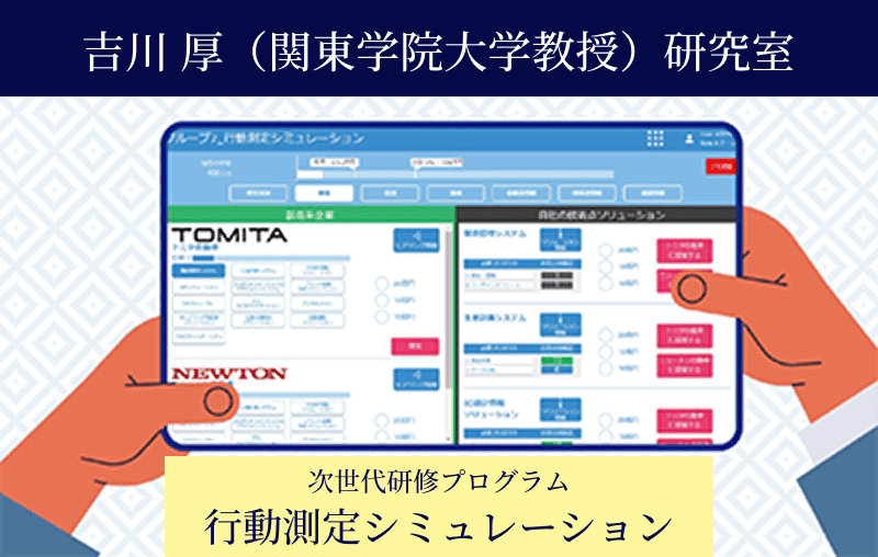 ビジネスゲームで能力測定する次世代研修プログラム。東京工業大学(当時)、関東学院大学の吉川厚研究室の監修を得て、産学連携で開発。部長、プロジェクトマネージャ、エンジニアの3職種について、ゲーム結果としてタイプ分類の情報を提供しています。